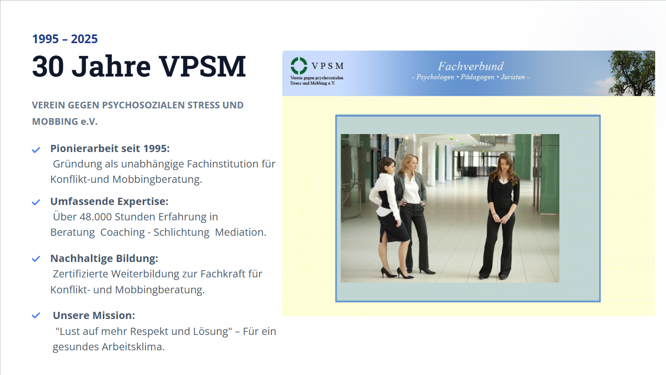 „Verein gegen psychosozialen Stress und Mobbing e.V.“ in Wiesbaden (www.vpsm.de).