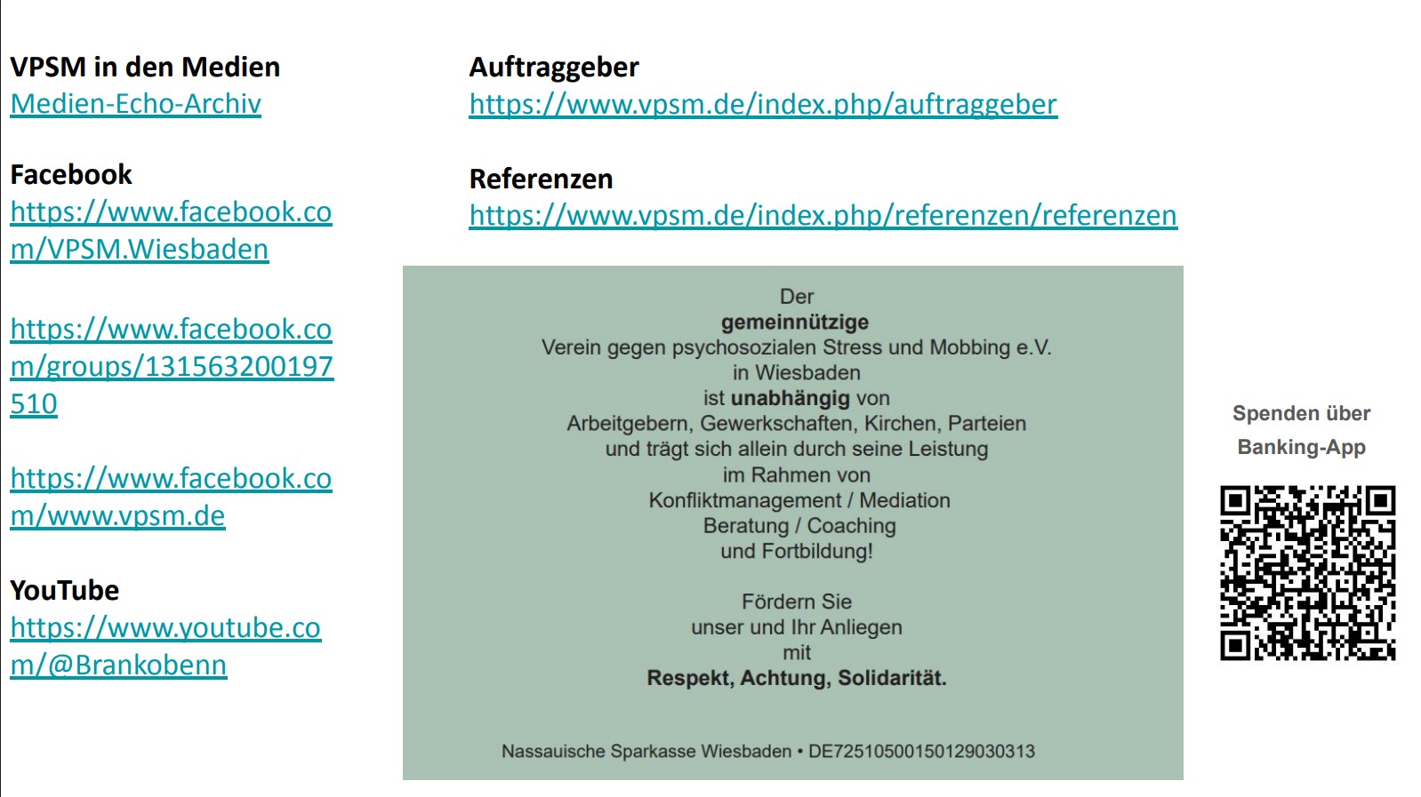 „Verein gegen psychosozialen Stress und Mobbing e.V.“ in Wiesbaden (www.vpsm.de).
